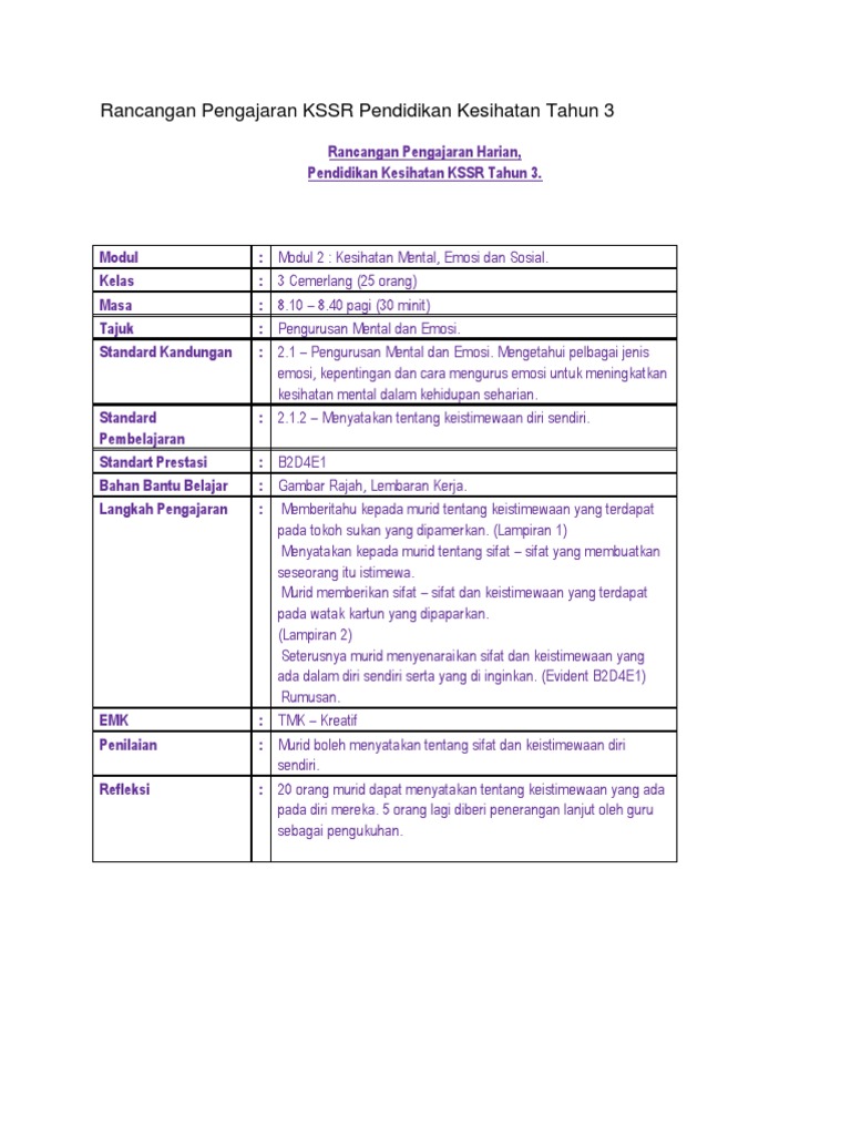 Rancangan Pengajaran Kssr Pendidikan Kesihatan Tahun 3 Pdf