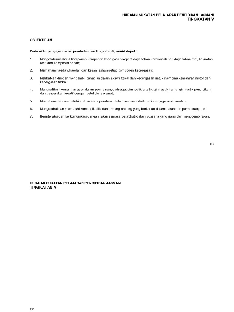 Huraian sukatan pelajaran pendidikan jasmani tingkatan 5. Bermula 2017 kurikulum bersepadu sekolah menengah akan digantikan secara berperingkat dengan kurikulum standard sekolah menengah. Untuk memudahkan guru-guru mendapatkan sumber rujukan sukatan pelajaran dan. Pemetaan Huraian Sukatan Pelajaran Tahun 1 hingga Tahun 6 dan Kelas Peralihan hingga Tingkatan 5.